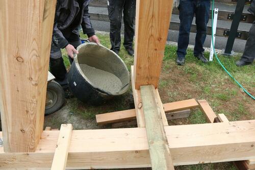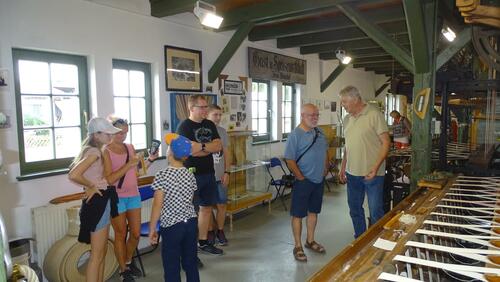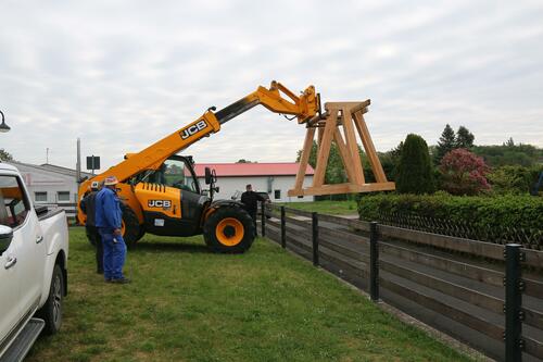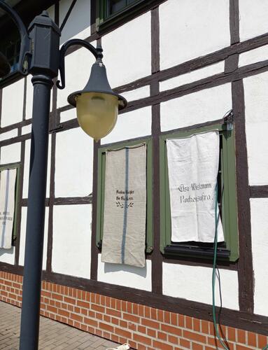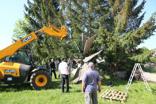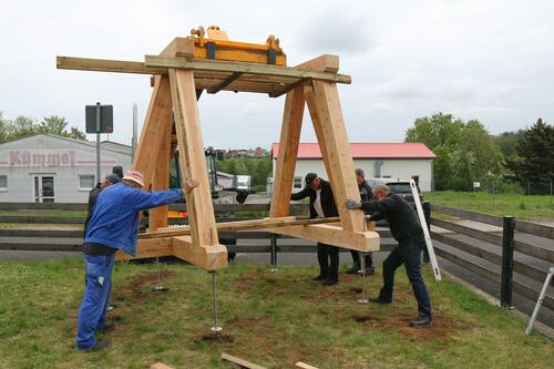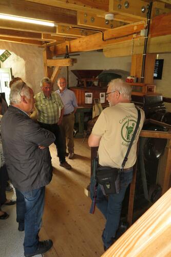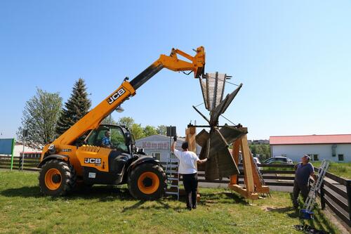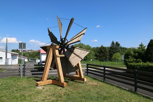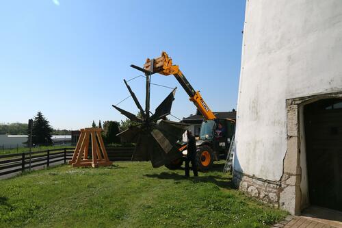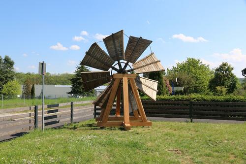 Damit die alte Windrose nicht mehr auf dem Boden liegt und dem Verfall preisgegeben ist, wurde eine Halterung gebaut, in die sie eingehängt wurde. Nun ist sie ein schöner Blickfang und begrüßt die Besucher vor der Mühle.